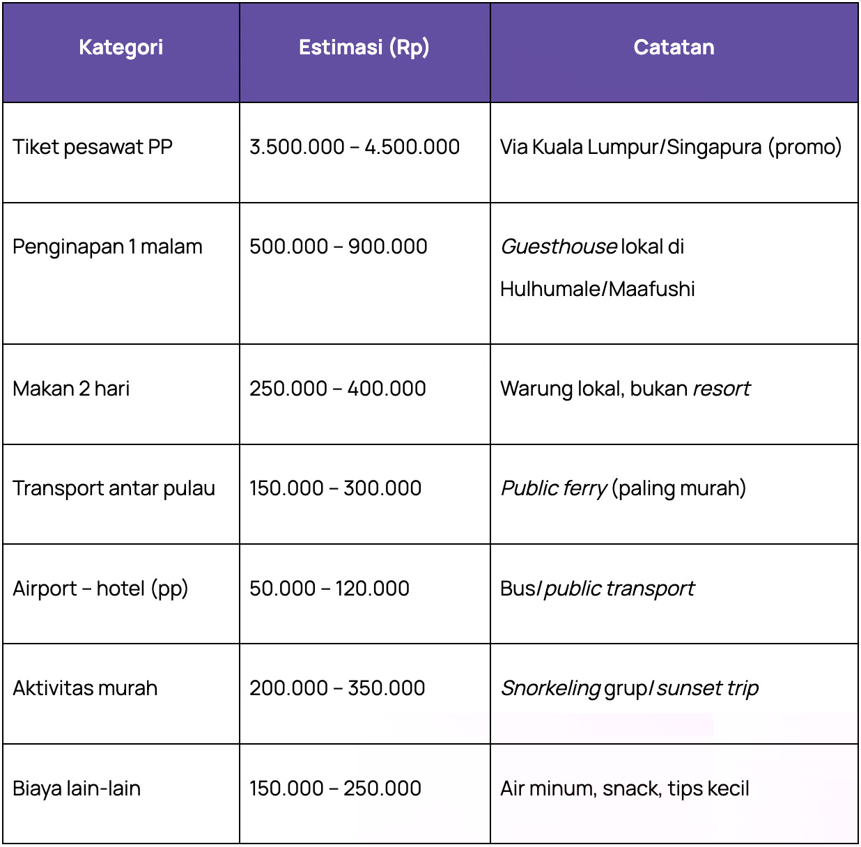 Supaya kamu lebih mudah membuat estimasi, berikut contoh budget liburan ke Maldives 2 hari 1 malam yang hemat.