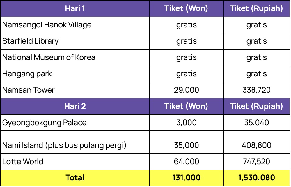 Berikut ini contoh itinerary liburan ke Korea Selatan dengan budget hemat. Dengan catatan biaya tersebut belum termasuk top up T mobile money dan biaya makan. Dengan estimasi biaya T-money sekitar 7000 won per hari dan dengan biaya makan rata-rata 10.000 won setiap kali makan, maka untuk 2 hari perjalanan, kamu membutuhkan biaya sebesar Rp2.500.000.