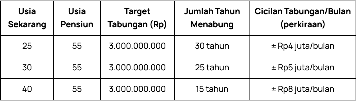 Maka kamu butuh Rp3 miliar (25 × 120 juta) sebelum pensiun.